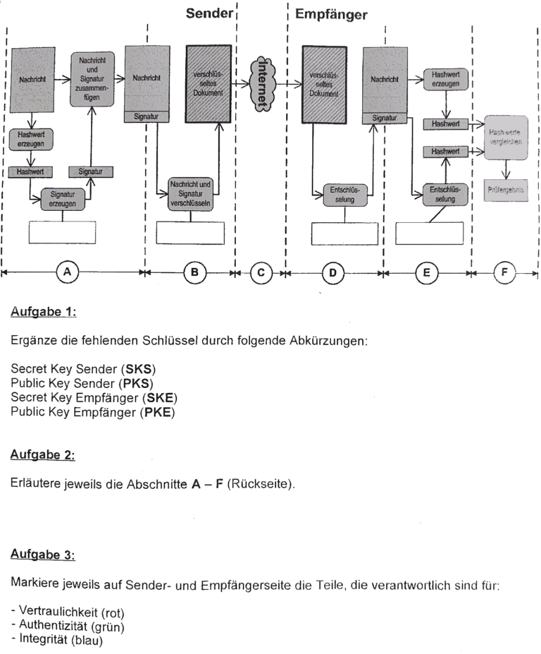 In diesem Abschnitt erzeugt der Empfänger einen Hashwert aus der empfangenen Nachricht und entschlüsselt die Signatur mit dem öffentlichen Schlüssel des Senders (PKS). Wenn der selbst erzeugte Hashwert mit dem entschlüsselten Hashwert übereinstimmt, ist die Signatur gültig. - Abschnitt F: Vergleich der Hashwerte